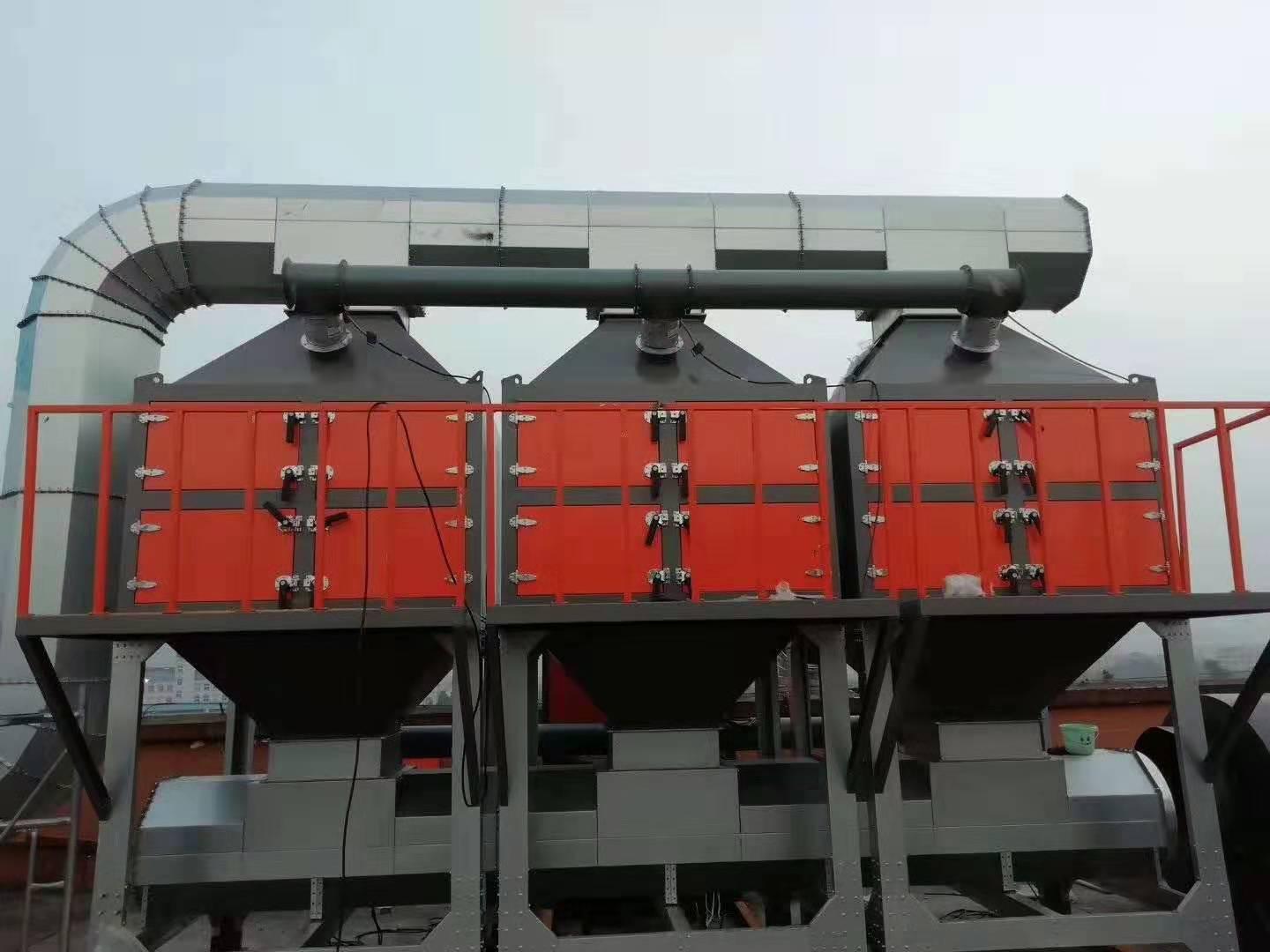 催化燃燒有機(jī)廢氣處理設(shè)備主要由廢氣管道、干式過濾器、活性炭吸附箱、電動調(diào)節(jié)閥門、催化凈化裝置、阻火器、排風(fēng)機(jī)、電氣控制等部分組成。
